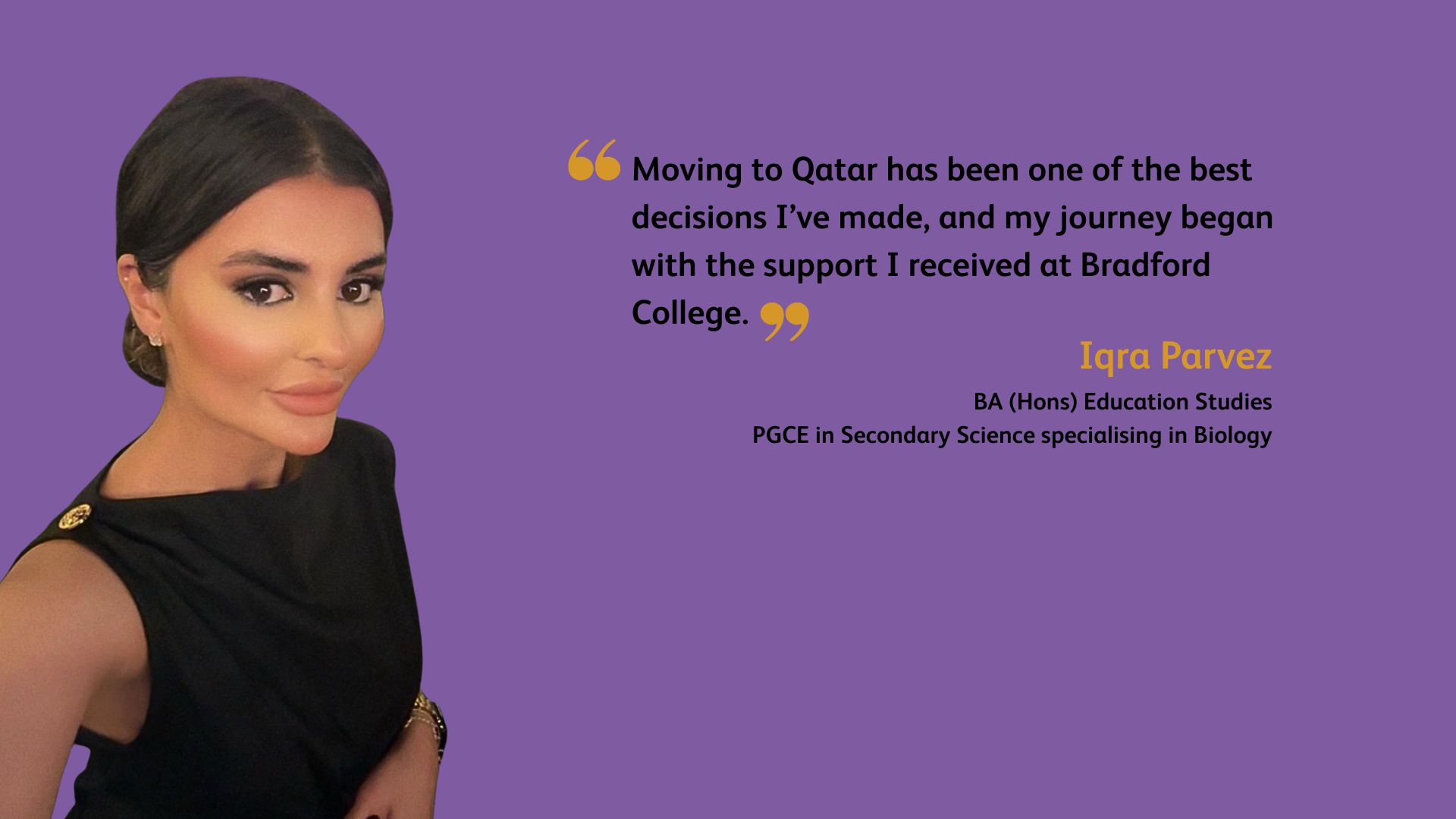 The School of Education was very robust and supportive… I was drawn to the approachable tutors and class sizes, which made me feel confident I would be encouraged to succeed. Iqra Parvez Bradford College Teaching Alumni