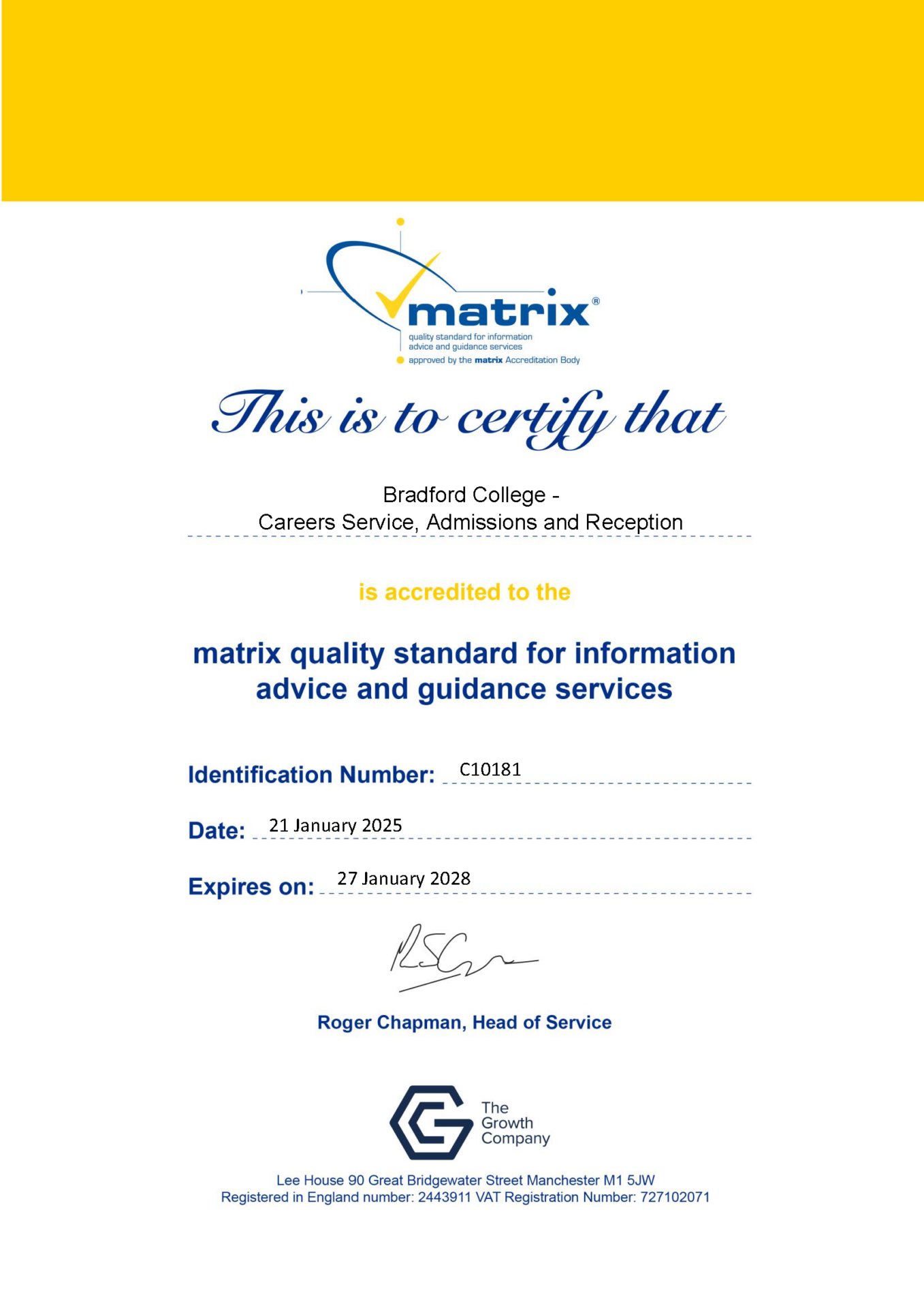 Regulated by the Department for Education, the ‘matrix Standard’ acknowledges the delivery of high-quality IAG to students at Bradford College.